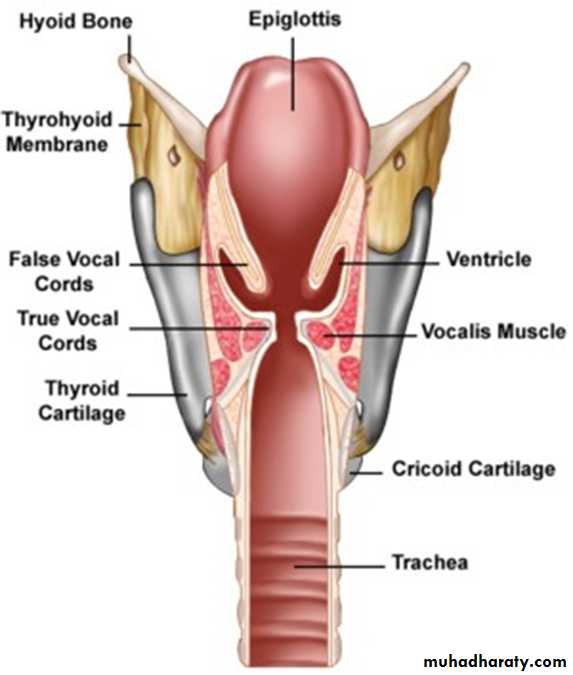 The vocal cords are two fold-like structures extending from the thyroid cartilage to the vocal process of the arytenoid cartilage.