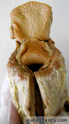 • - Situated in the midline of the neck, in front of the laryngopharynx from the level of the 3rd- 6th cervical vertebrae.