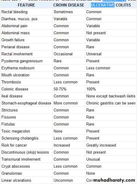Approximately a quarter of patients present in childhood or adolescence. Crohn disease can affect any part of the gastrointestinal tract from mouth to anus, whereas in ulcerative colitis the inflammation is confined to the colonUlcerative colitis