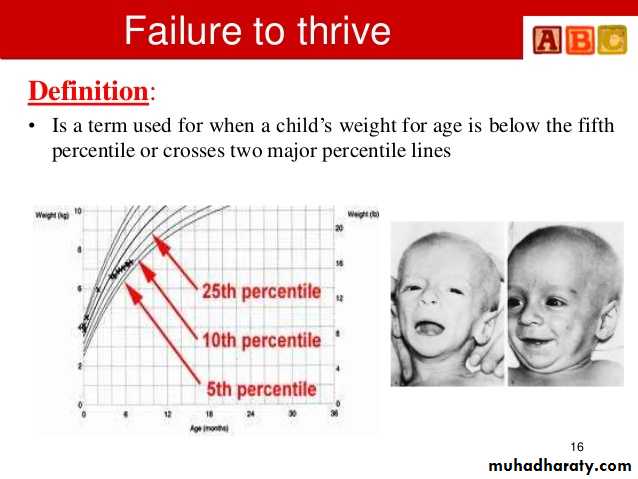 The term ‘failure to thrive’ is used to describe suboptimal, weight gain in infants and toddlers (malnourished infants and young children who fail to meet expected standards of growth).FTT is a common problem in pediatrics, affecting 5% to 10% of young children and approximately 3% to 5% of children admitted to hospitals.