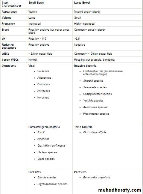 1- non-inflammatory diarrhea through enterotoxin production by some bacteria, destruction of villus (surface) cells by viruses, adherence by parasites, and adherence and/or translocation by bacteria2- Inflammatory diarrhea is usually caused by bacteria that directly invade the intestine or produce cytotoxins