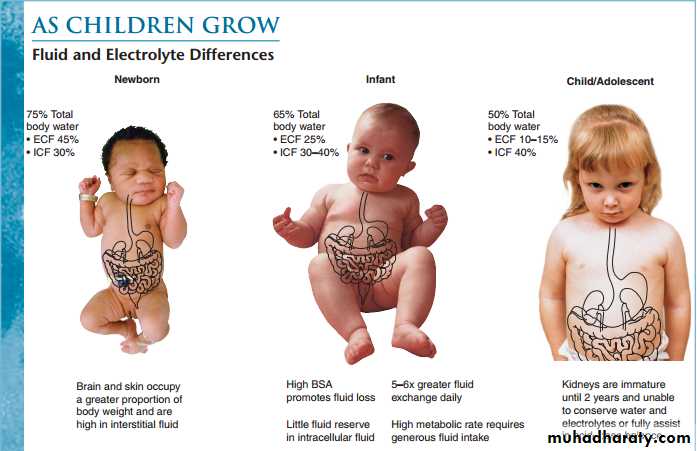 Infants are at particular risk of dehydration because they have a greater surface area to weight ratio than older children, leading to greater insensible water losses .They have higher basal fluid requirements (100–120 ml/kg per day, i.e. 10–12% of bodyweight) and immature renal tubular reabsorption. In addition, they are unable to obtain fluids for themselves when thirsty.