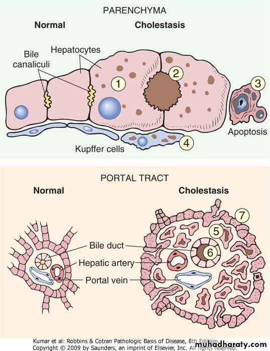 CHOLESTASIS.systemic retention of bilirubin & other solutes eliminated in bile .clinical features (jaundice, pruritis, skin xanthomas, malabsorption syndrome).results from -defects in hepatocyte bile secretion -biliary obstruction .characteristic laboratory finding is elevated serum alkaline phosphatase