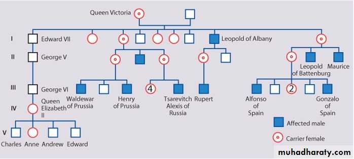 2. occasionally a female carrier shows mild signs of the disease (manifesting carrier)3. each son of a female carrier has a 1 in 2 (50%) risk of being affected
