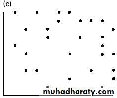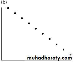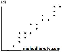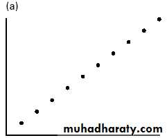 The relation between two continuous variables can be displayed graphically as a scatter plot. One variable is represented on the horizontal axis and the other on the vertical axis. Each pair of measurements is then represented as a dot. [ -1 < r < 1 ]