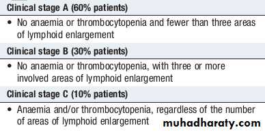 Initial therapy for those requiring treatment (stages B and C) may consist of oral chemotherapy with the alkylating agent chlorambucil (reduce the abnormal lymphocyte mass and produce symptomatic improvement).