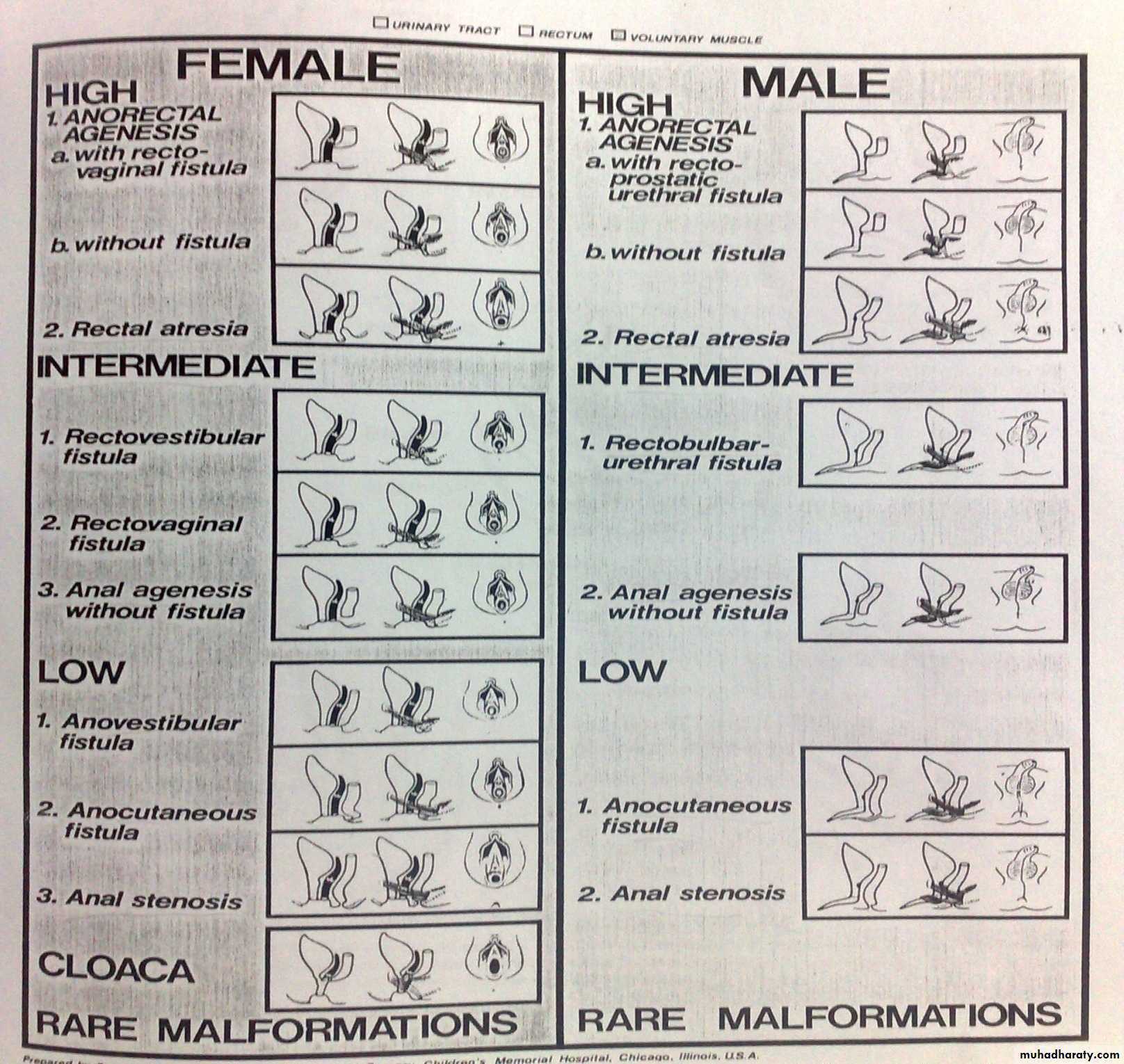 -vagina in female. b-without fistula(anorectal agenesis or atresia).