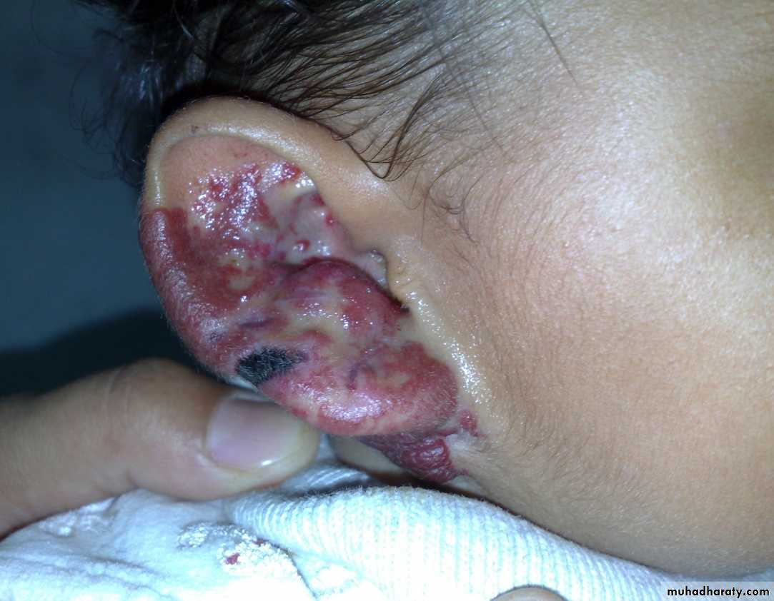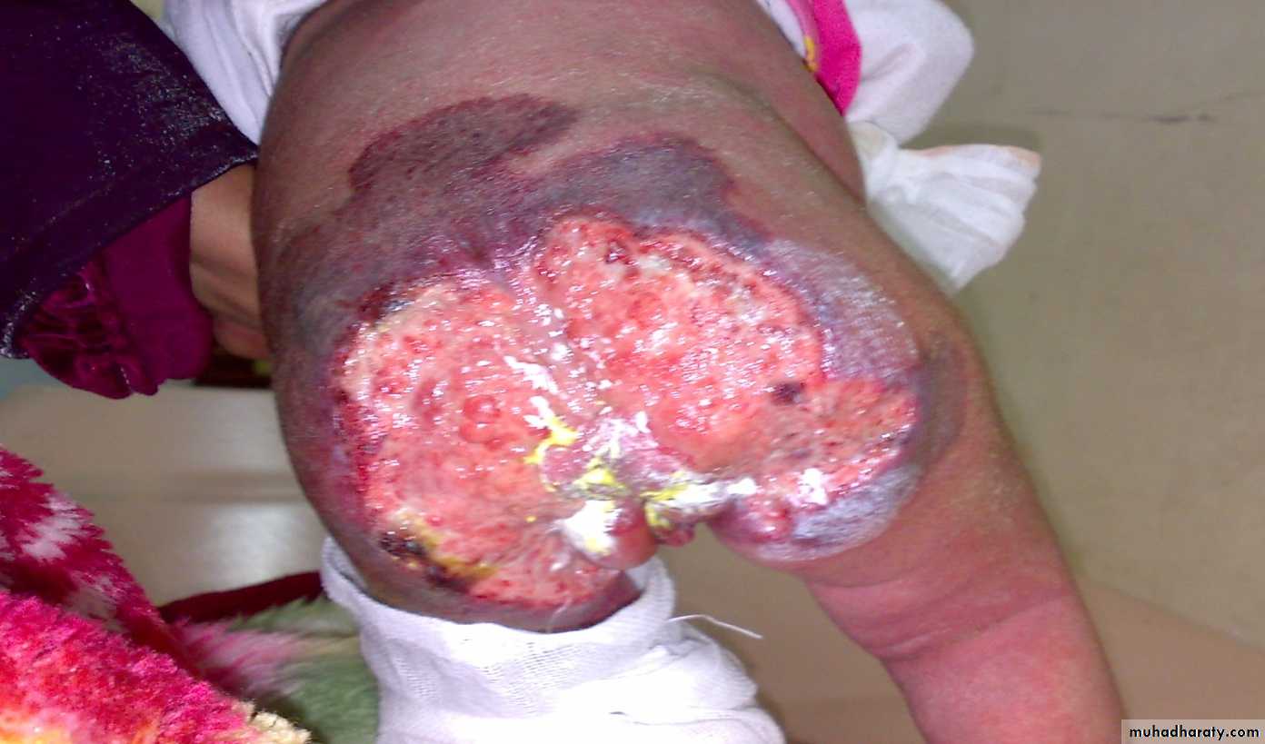 - Can be treated by dressing & systemic antibiotics.