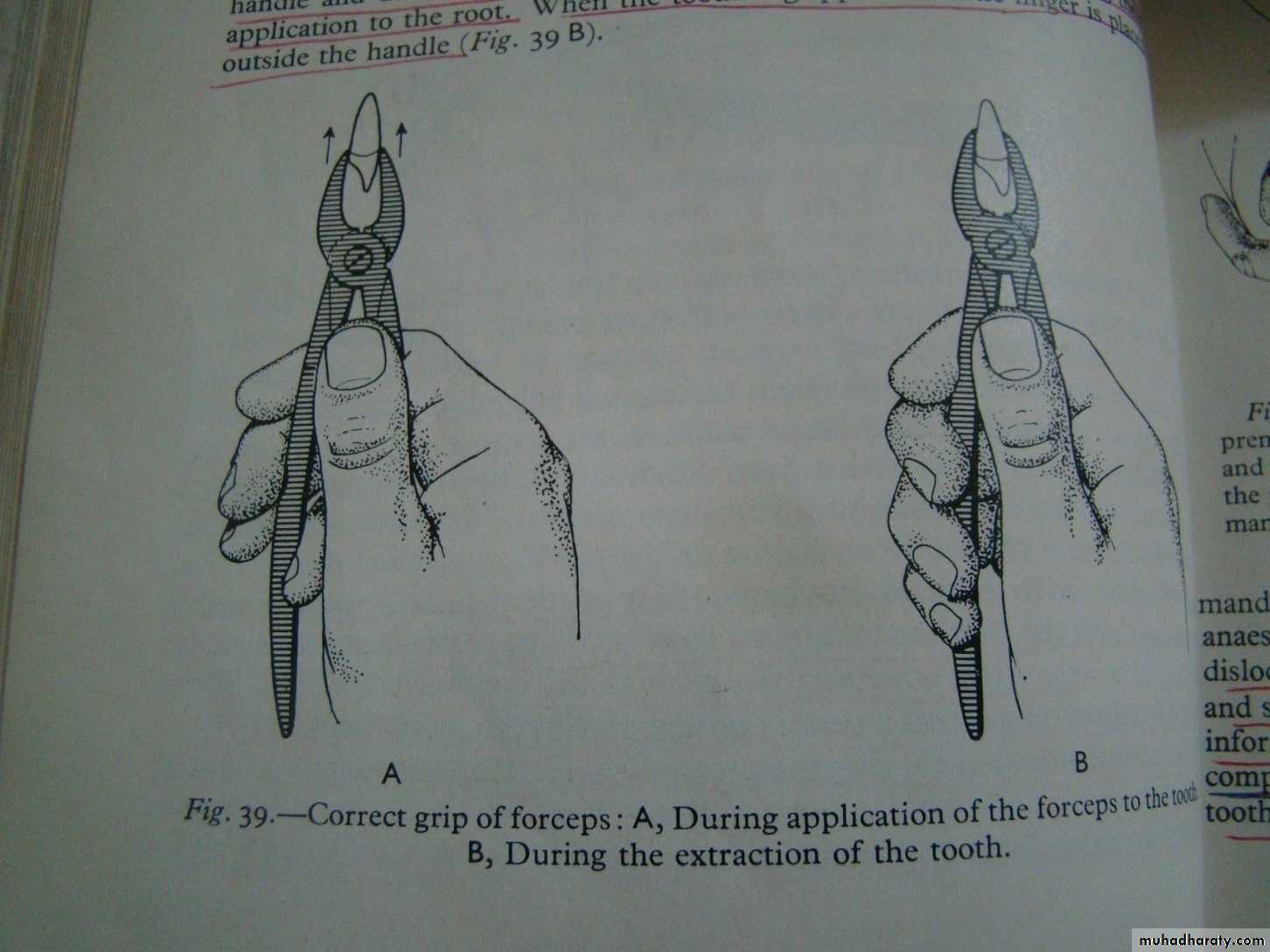 The position of the thumb just below the joint of the forceps, and position of the forceps handle in the palm of the hand, give the operator a firm grip on , and fine control over the forceps.The little finger is placed inside the handle and used to control the opening of the forceps blades during their application to the root mass. When the tooth is gripped the little finger is placed out side the handle.