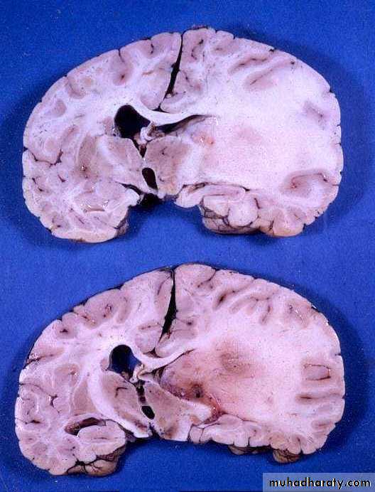 • Frontal lobe lesions: presents with personality changes, gait ataxia, and urinary incontinence, contralateral hemiparesis if posterior frontal and expressive dysphasia if involving the dominant inferior frontal gyrus.