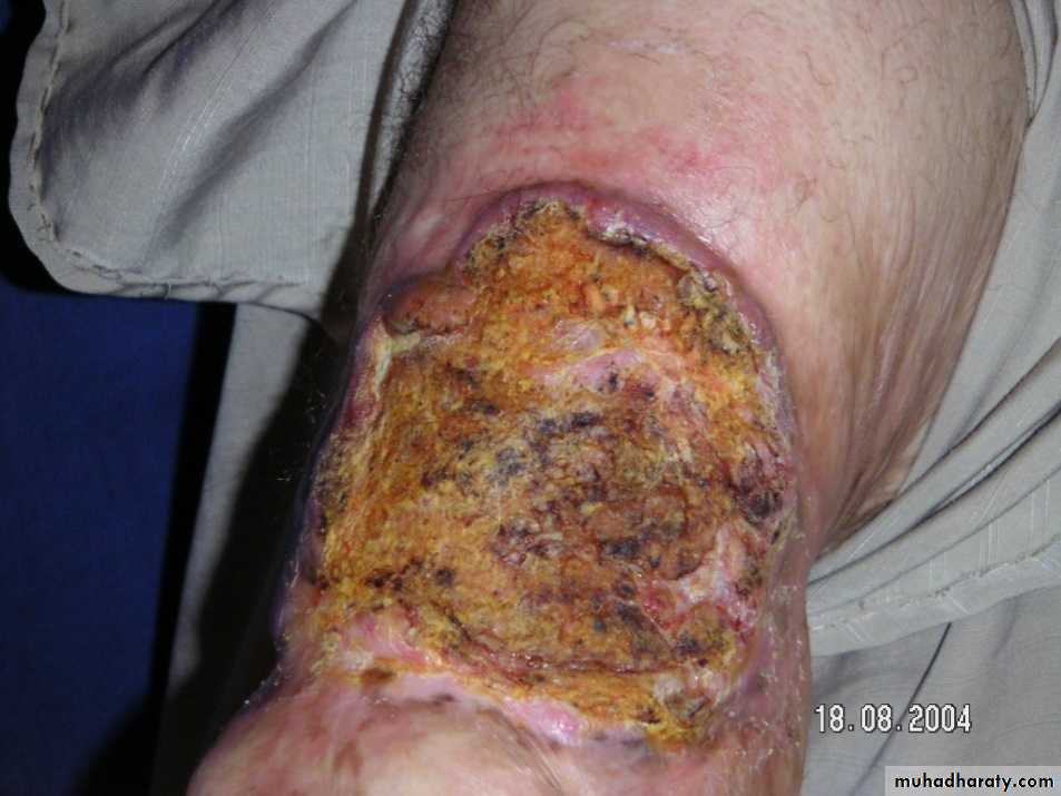 Clinically: present as irregular ulcer, everted edge, indurated base,attached deeply, blood-stained discharge,frequent lymph n. positive.