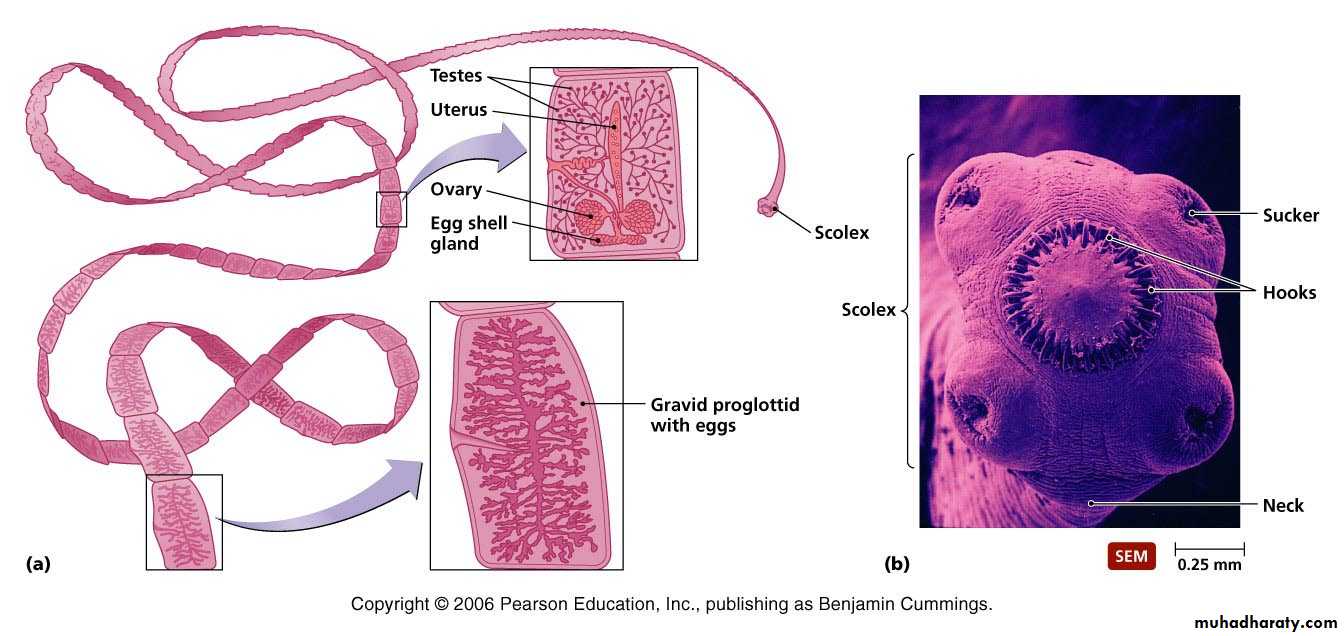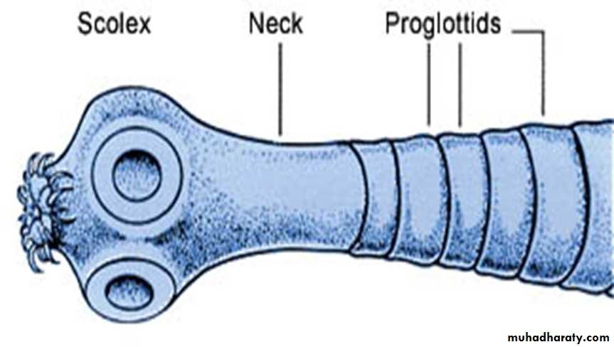 Cestodes are ribbon-shaped worms which inhabit the intestinal tract. They have no alimentary system and absorb nutrients through the tegumental surface. The anterior end, or scolex, has suckers for attaching to the host. From the scolex arises a series of progressively developing segments, the proglottides, which, when shed, may continue to show active movements.Adult Tape Worm