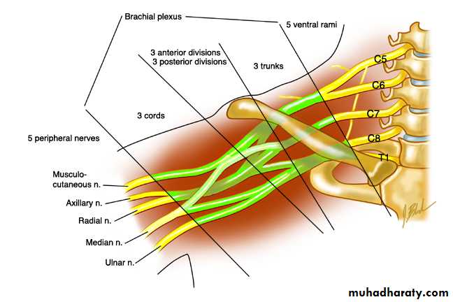 Erb’s palsy is caused by injury of C5, C6 and (sometimes) C7. The abductors and external rotators of the shoulder and the supinators are paralysed.