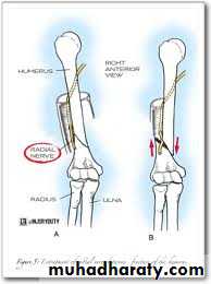 fractures or dislocationsat mid shaft of humerus or at the elbow,