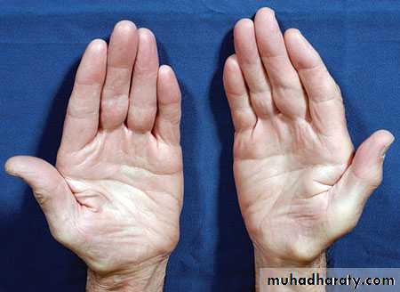 or shaking the arm, may relieve the symptoms.In advanced cases there may be clumsiness and weakness