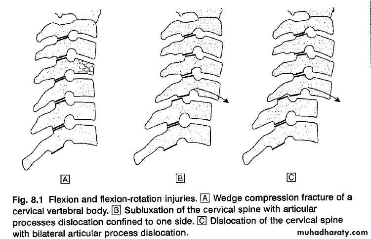 flexion alone tends to a wedge compression fracture .whereas combined flexion and rotation cause subluxation ,
