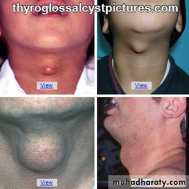 Common sites(beneath the foramen cecum , floor of the mouth, above hyoid, beneath the hyoid on thyroid cartilage, at the level of cricoid cartilage