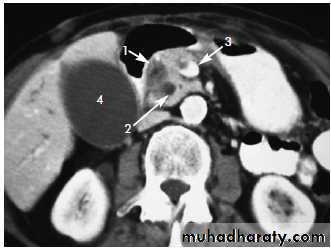 • CT scan: the preferred test is contrast enhanced CT scan:• It guides for percutaneous FNAC. If the tumor is small (less than 4 cm) and confined to the head without evidence of distant metastasis or vascular invasion should undergo surgery.