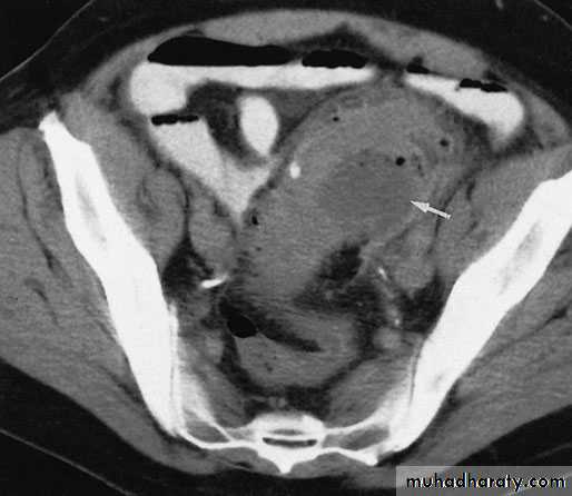 Computerized tomography scan showing a segment of thickened sigmoid colon with a paracolic abscess (arrow) in a patient with diverticulitis.