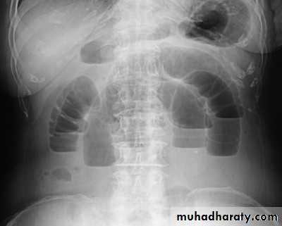 The abdomen becomes distended and tympanitic. The patient become increasingly toxic with rapid thread pulse and cold extremities with cyanosis " circulatory failure“.Investigation: