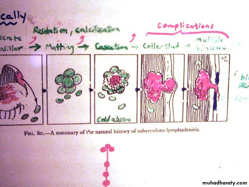 • 3-Multiple tubercles will form, coalesce, break down to form cold abscess.