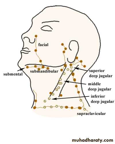 Level II—upper jugular chain nodes drain the face, parotid gland, and the submandibular, submental and retropharyngeal nodes, nasal cavity, pharynx, larynx, external auditory ca-nal, middle ear, and from sublingual and submandibular glands.