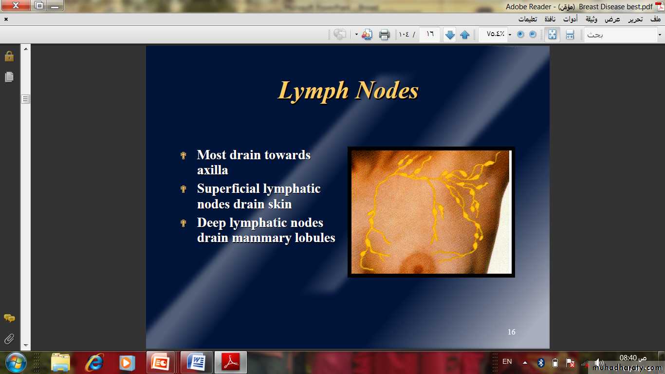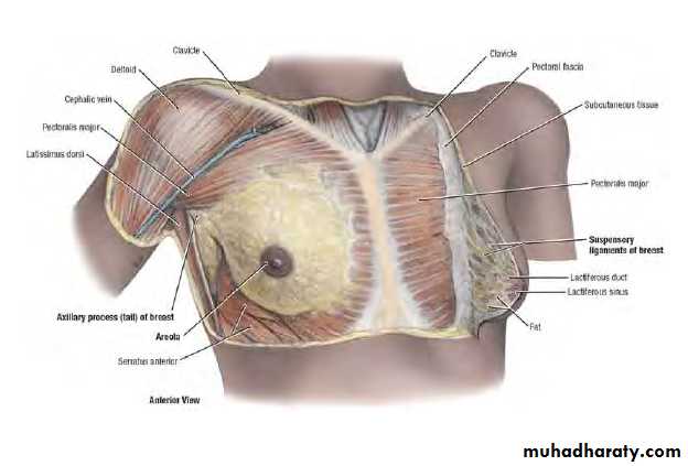 • The Mammary gland Lies between the superficial and deep layers of the pectoral fascia of the chest wall.