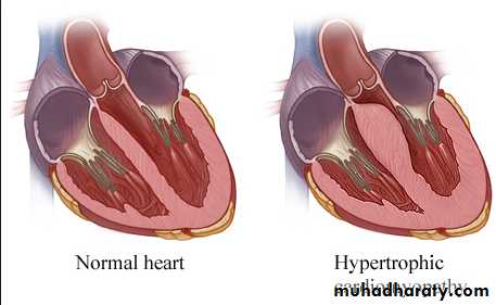 The hypertrophy may be generalised or confined largely to the interventricular septum (asymmetric septal hypertrophy or other regions (e.g. apical hypertrophic cardiomyopathy)