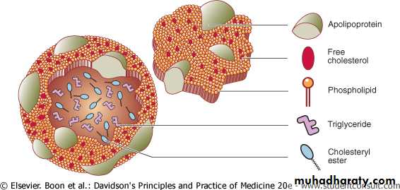 Plasma lipoproteins : large complexes composed of hydrophobic core of TG and cholesterol ester(CE), enveloped byhydrophilic surface coat of phospholipid (PL), unesterified ("free") cholesterol, and apolipoproteins (with detergent-like properties),