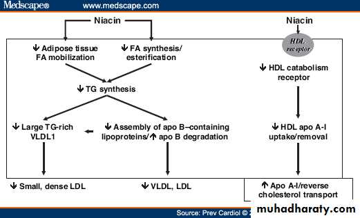 In pharmacological doses, this reduces peripheral fatty acid release with the result that cholesterol and TG decline whilst HDL increases.