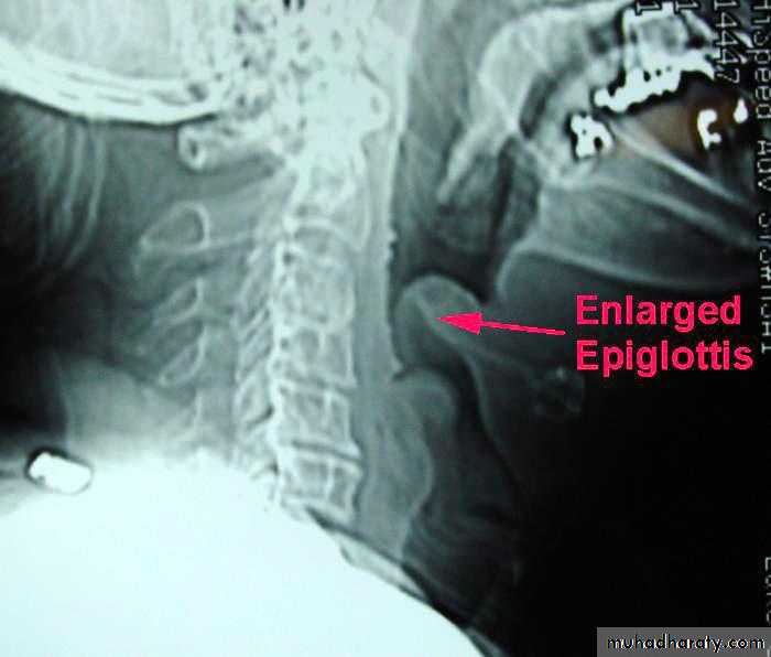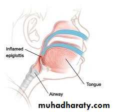 Clinical features :Mostly affects young children. Fever and sore throat, progressing to stridor and dysphagia caused by swelling of epiglottis and surrounding structures. Due to H. influenzae type bComplications: Death from asphyxia, which may be precipitated by attempts to examine the throat-avoid using a tongue depressor or any instrument unless facilities for endotracheal intubation or tracheostomy are immediately available