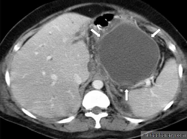 3. Acute pseudocyst: collection of pancreatic juice enclosed by a wall of fibrous or granulation tissue, occurring at least 4 weeks after onset of symptoms, is round or ovoid and most often sterile; when pus is present, lesion is termed a ‘pancreatic abscess’