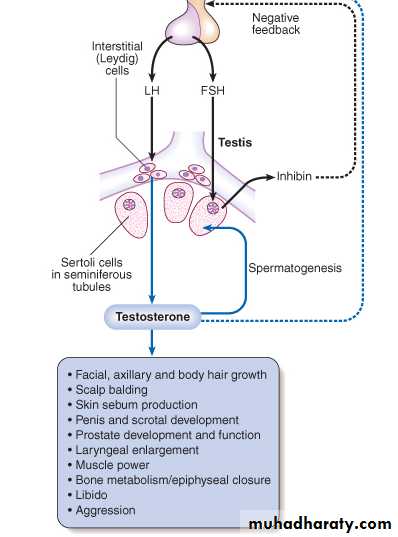 In the male, the testis subserves two principal functions: synthesis of testosterone by the interstitial Leydig cells under the control of luteinising hormone (LH), and spermatogenesis by Sertoli cells under the control of follicle-stimulating hormone (FSH) (but also requiring adequate testosterone)..Definition