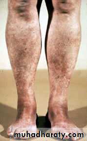 Pretibial myxoedemaOccurs in 1-2% patients with Graves' disease as painless thickening of the skin, nodules or plaques due to deposition of glycos-amino-glycans substance Usually occurs on shins or dorsumof foot Strongly associated with ophthalmopathy, there is high level of antibody.Respond to local steroid and disappear after treatment of thyroid toxicity
