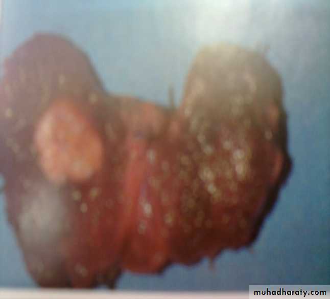 Medullary Carcenoma :Arise from parafolliculer cells.There is high level of calcitonen and 5HT, which may cause diarrhea.Represent 5% of thyroid tumor.It may be sporadic ( 80% )or familial which is occur in children and young age, its more invasive, multifocal and may associated with(MEN-2- A) as parathyroid hyperplasia medullary carcinoma, Phiochromcytoma , or with (MEN-2-B) as parathyroid hyperplasia or tumor, Phiochromcytoma with skin pigmentation, multiple neuromas in the tongue and mucous membrane and marfanoid habits. It metastasize by lymph and blood. Prognoses is good without metastases. FNA is diagnostic.Surgery is the treatment of choice.Family screen in case of familial type.