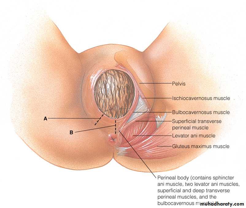 A mediolateral episiotomy is usually recommended; a midline episiotomy results in less bleeding, quicker healing and less pain, however,there is an increased risk of extension to involve the anal sphincter (third/ fourth-degree tear).