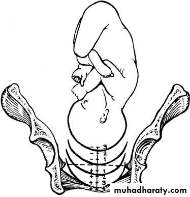 As the head descends past the ischial spines, the stations are referred to as +1 through +5 (head visible at the introitus).