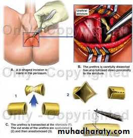 Some surgeons advocate early open repair of urethra with excision + spatulation + end to end anastamosis of the urethraOther surgeons wait longer