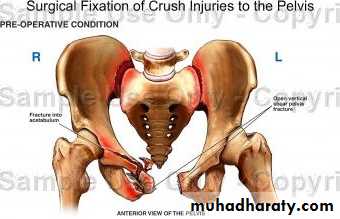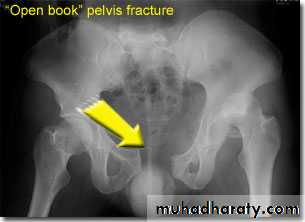 Two types of fracture pelvis .. 1.hemipelvic displacement 2.butterfly fractureabout 10-15%of cases of fractured pelvis have associated urethral inj.