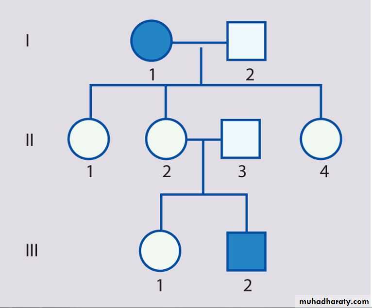 • Male and female offspring each have a 1 in 2 (50%) chance of inheriting the abnormal gene from an affected parent