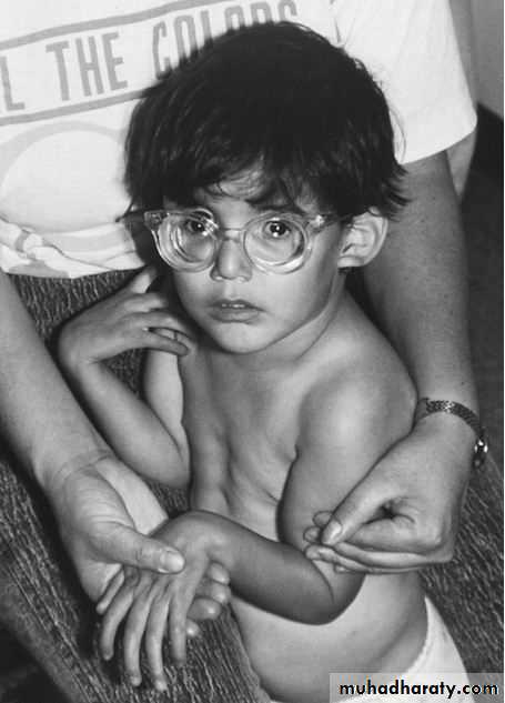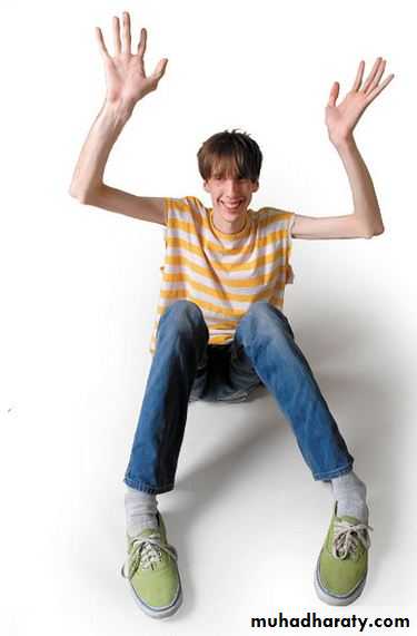 Clinical symptoms mostly involve three systems: cardiac, musculoskeletal, and ophthalmologic. Musculoskeletal findings include dolichostenomelia (a tall, thin body habitus), arachnodactyly (spider-like fingers and toes), abnormalities of the sternum (pectus excavatum or carinatum), kyphoscoliosis, pes planus, and joint laxityEye findings include high myopia, which eventually can lead to vitreoretinal degeneration; an abnormal suspensory ligament of the lens, which can lead to ectopia lentis (dislocation of the lens; in Marfan syndrome, the lens usually dislocates upward and outward); and cataracts. Cardiac findings include a weakened aortic wall, which leads to progressive dilation of the aortic root. Aortic insufficiency followed ultimately by aortic dissection is a common complication of this disorder