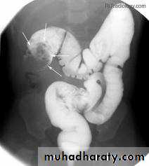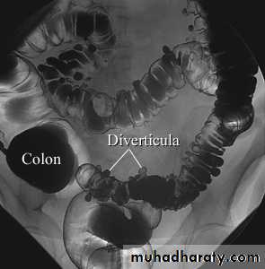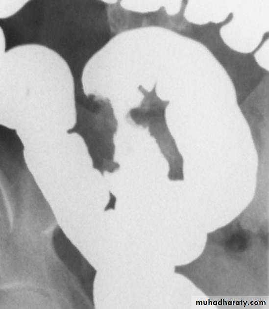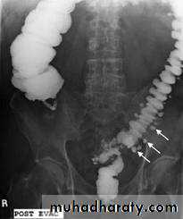 • Pseudodiverticula-from bulging area of normal wall opposite side of scarring from disease, usually on anti-mesenteric side