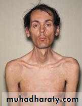 -Hatchet-face appearance due to facial muscle atrophy and weakness .