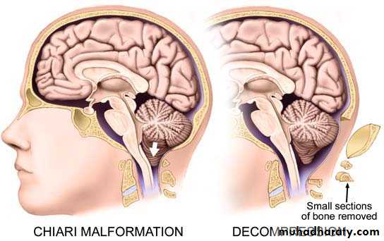 Treatment of Chiari malformation include:• Treatment of associated Hydrocephalus, and then