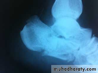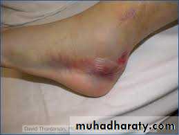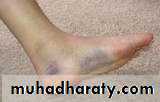 Clinical features: There is usually a history of a fall from height or road traffic accident . The foot is painful and swollen and a large bruise appears on the lateral aspect of the heel, after1-2 days ecchymosis spreads into the sole of the foot . The heel may look broad and squat.