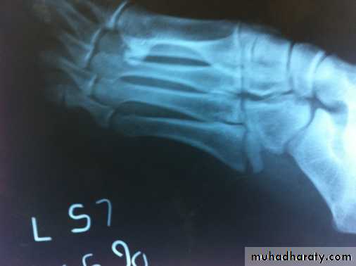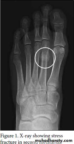 Young adult (a military recruit or a nurse) or osteoporotic women affected usually, the foot may become painful and slightly swollen after overuse. A tender lump is palpable just distal to the midshaft of a metatarsal bone (usually the second metatarsal) .X-ray appearance may at first be normal but a radioisotope scan will show an area of intense activity in the bone. Later a hairline crack may be visible and later on a callus. No displacement occurs and neither reduction nor splintage is necessary. The forefoot may be supported with an elastic bandage and normal walking is encouraged.