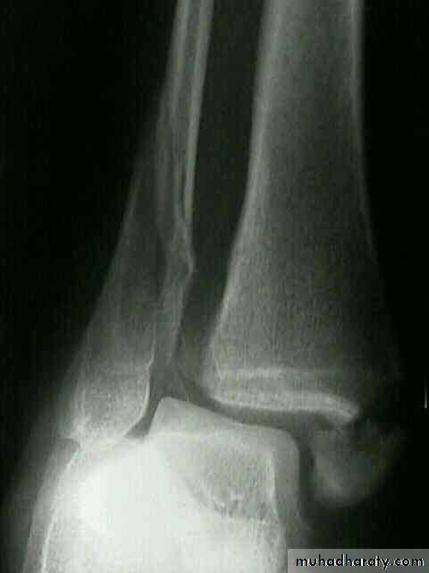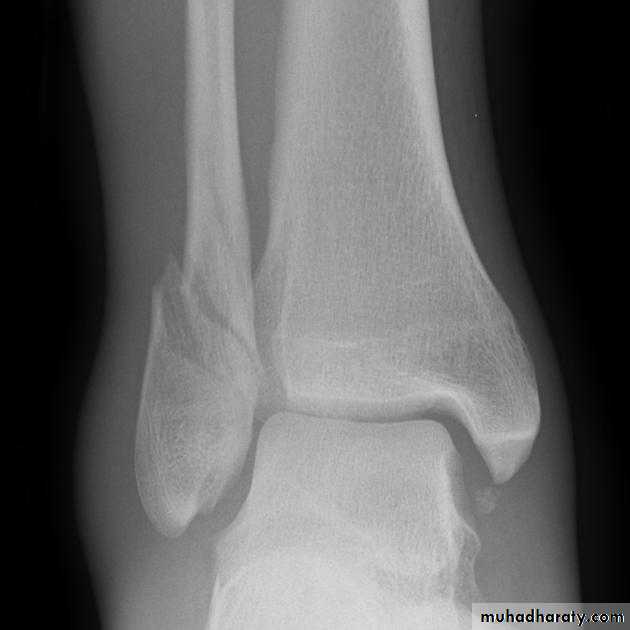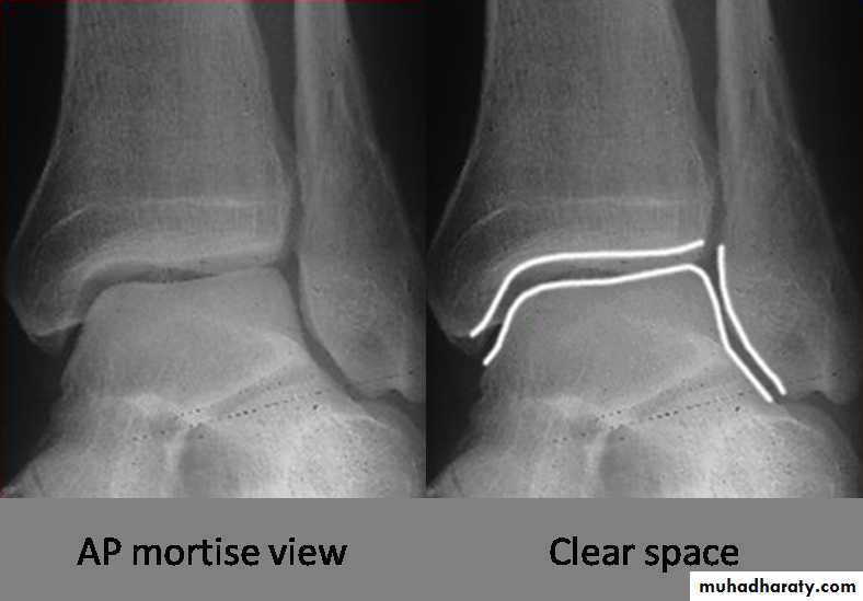X ray: it is essential to do anteroposterior, lateral and mortise views (The AP mortise view is done with the leg internally rotated 15-20o ,This view permits examination of the articular space (clear space). The width of the clear space between the talus and the articular surfaces of the medial malleolus, the tibial plafond and the lateral malleolus should be equal.