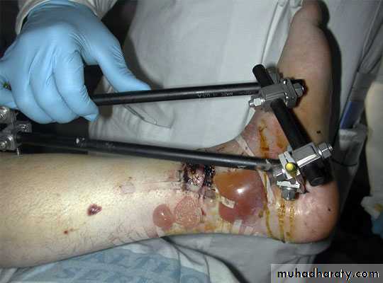 External fixation: This method is particularly suitable for open fractures in which the risk of infection may preclude internal fixation, and for fractures that are already infected.