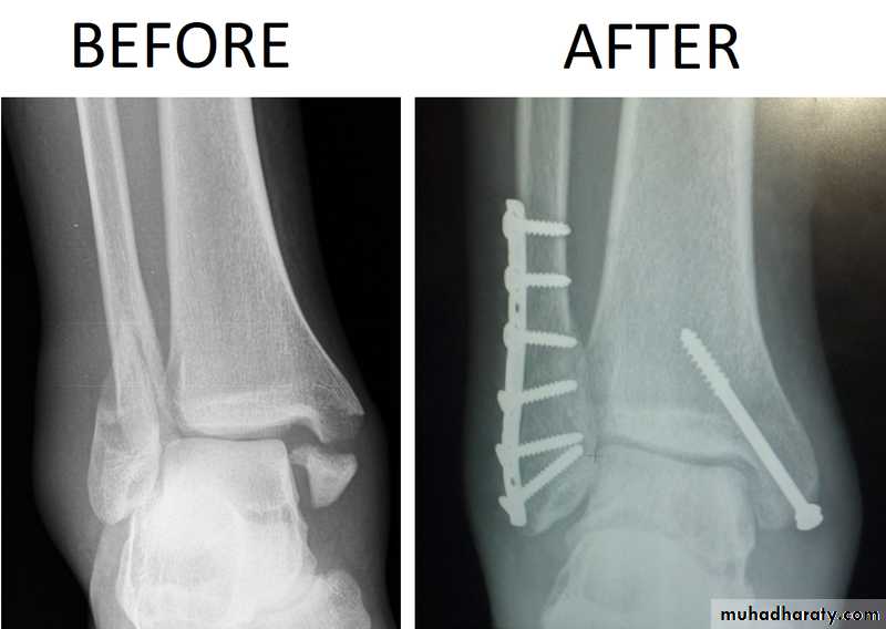 For displaced fractures and failed conservative treatment, open reduction and internal fixation is mandatory by malleolar screws, plate and screws.