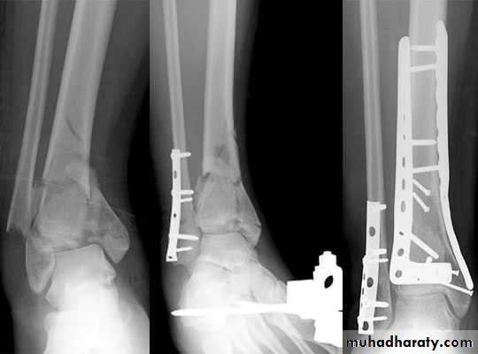 The early surgery is better for displaced fractures. If the patient presented late (after 8 hours) , the defenitive treatment should be delayed until the swelling subside to avoid infection and skin blusters and necrosis.